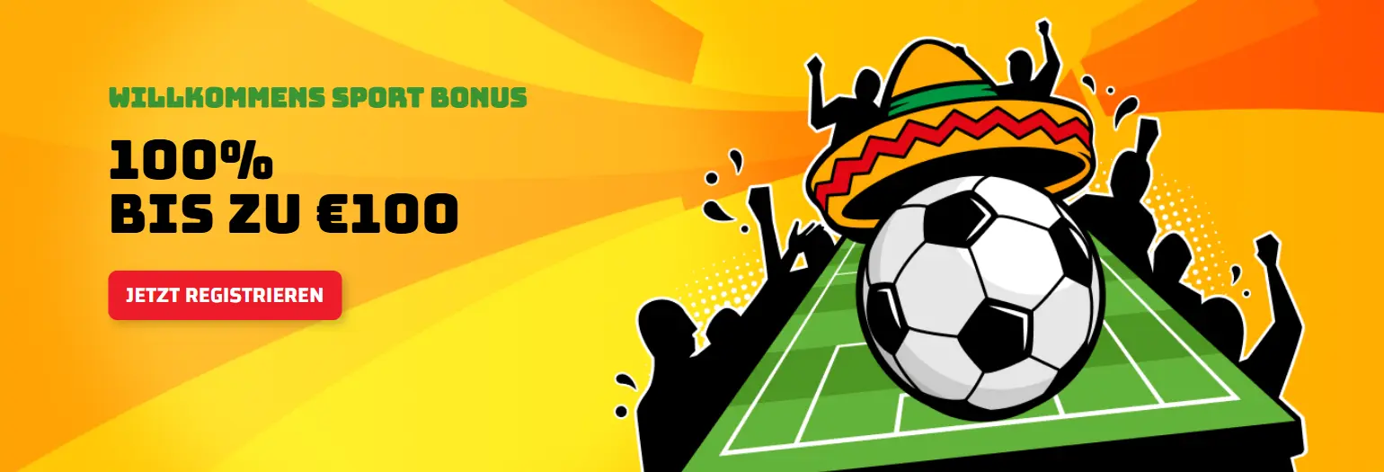 Neue Sportwettenkunden erhalten 100 % bis zu 100 € plus eine Gratiswette. Die Mindestquote liegt bei 1.7, der Bonus muss 6x umgesetzt werden.