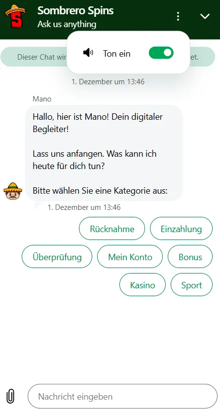 Das Sombrero Spins Casino legt großen Wert auf zuverlässigen und schnellen Kundenservice. Der 24/7-Live-Chat ist der schnellste Kontaktweg und bietet meist innerhalb von wenigen Minuten eine Antwort – selbst abends oder am Wochenende. Die Mitarbeiter unterstützen in mehreren Sprachen, darunter Deutsch während der europäischen Hauptzeiten, was die Kommunikation deutlich erleichtert.