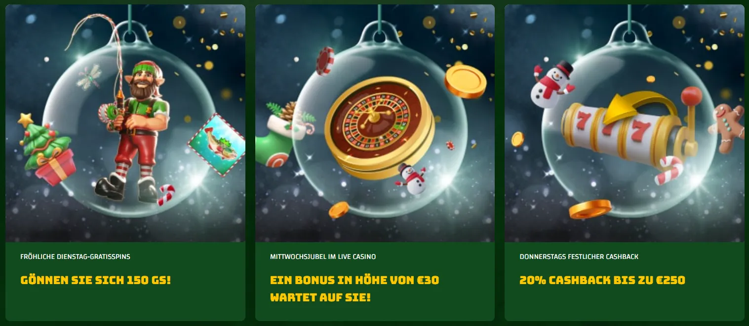 Das Casino hält das Spielerlebnis durch wiederkehrende Angebote lebendig: Reload-Bonusse, Freispiele, Cashback für Sportwetten sowie wöchentliche Bonusaktionen gehören zum festen Bestandteil. Darüber hinaus sorgen Turniere und saisonale Specials für zusätzliche Gewinnchancen und Abwechslung. Alle Aktionen sind mit klaren Konditionen verbunden und lassen sich direkt im Promotionsbereich einsehen.