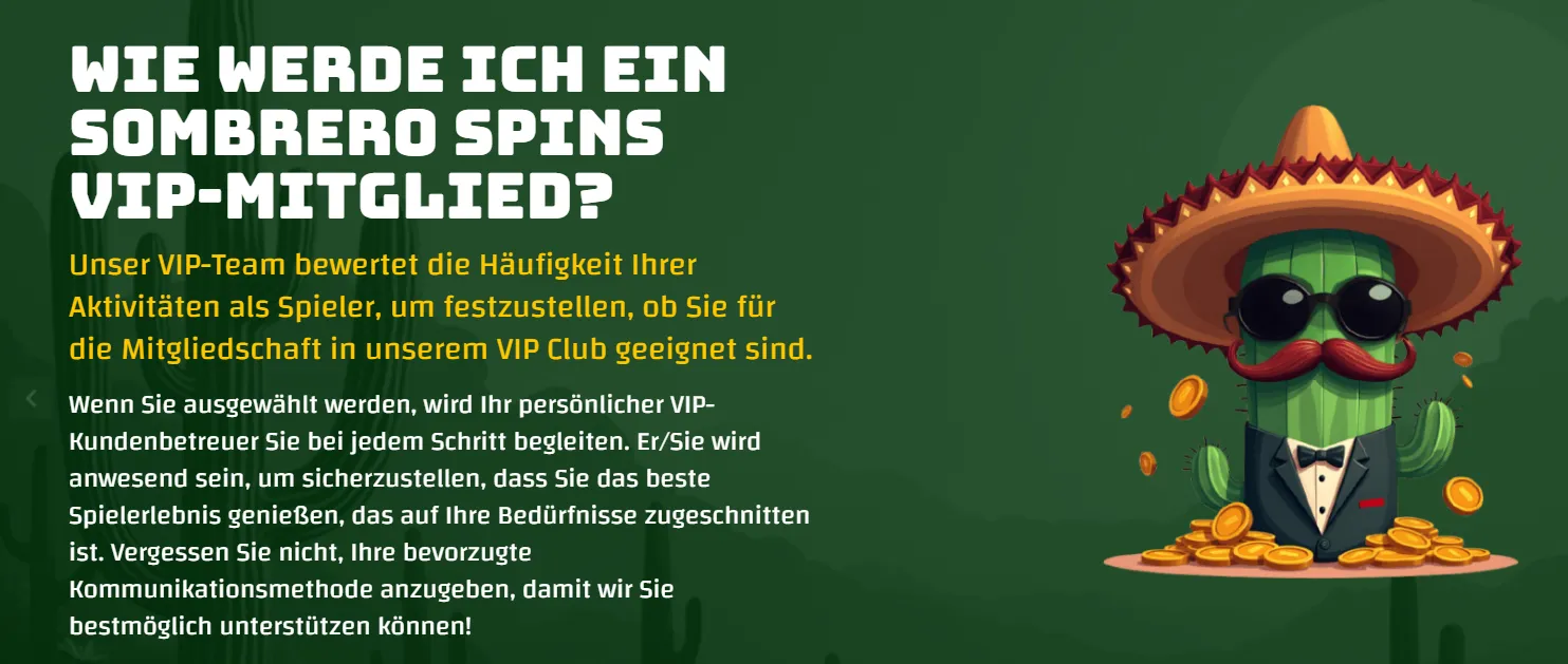Ein klassisches, stufenbasiertes VIP-System gibt es bei Sombrero Spins nicht. Stattdessen erhalten aktive Spieler maßgeschneiderte Vorteile, darunter bevorzugte Auszahlungen, persönliche Betreuung und Zugang zu exklusiven Aktionen. Die Vergabe basiert auf Aktivität und Spielerstatus, ohne fixe Punkte oder Levels – ein flexibles System, das treue Spieler belohnt.