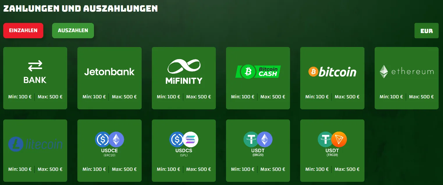 Alle Methoden haben festgelegte Limits: 100-500 € pro Auszahlung. Dies bietet Transparenz, erfordert jedoch bei hohen Gewinnen mehrere Transaktionen.