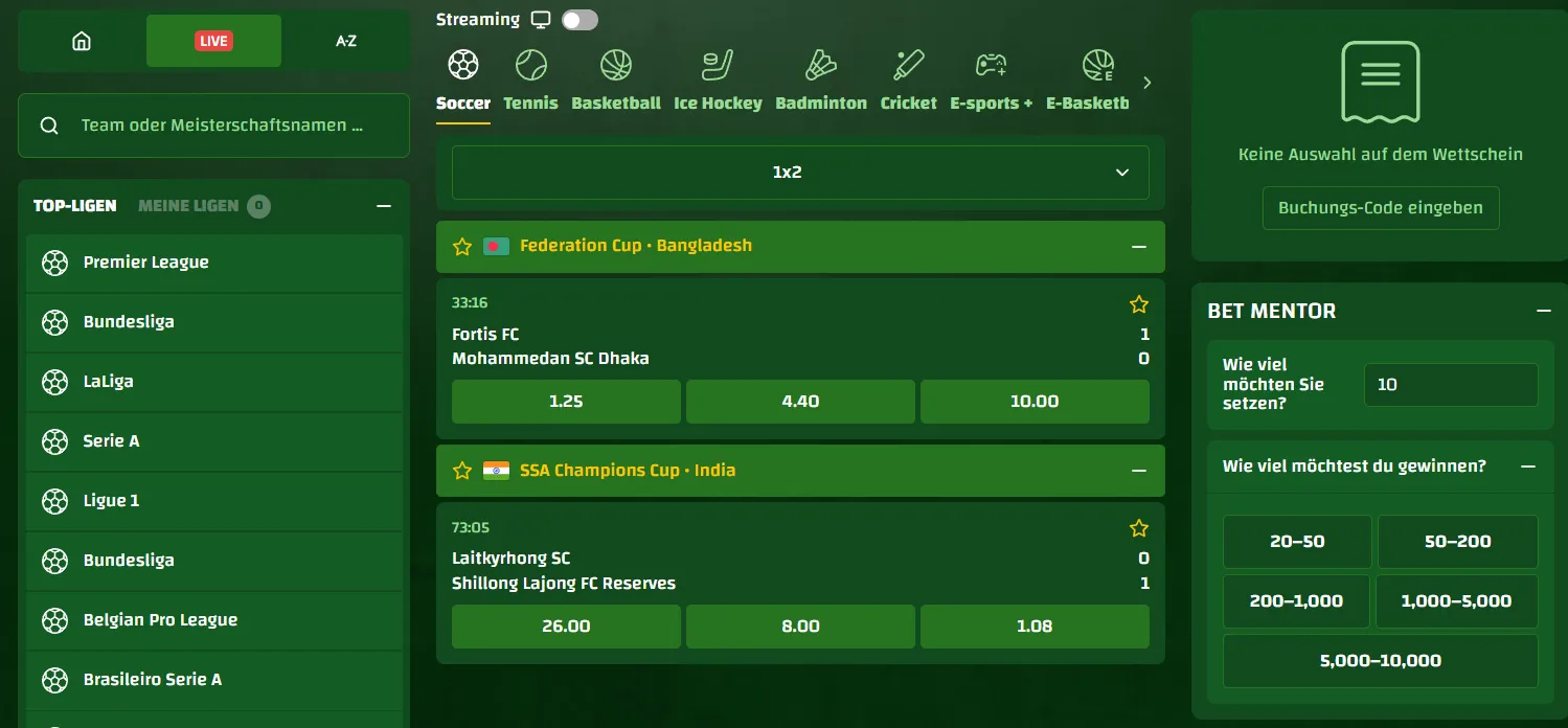 Spieler können auf alle großen Wettbewerbe setzen – darunter Bundesliga, Premier League, LaLiga, Champions League, Tennis, Basketball, Eishockey sowie virtuelle Sportarten.