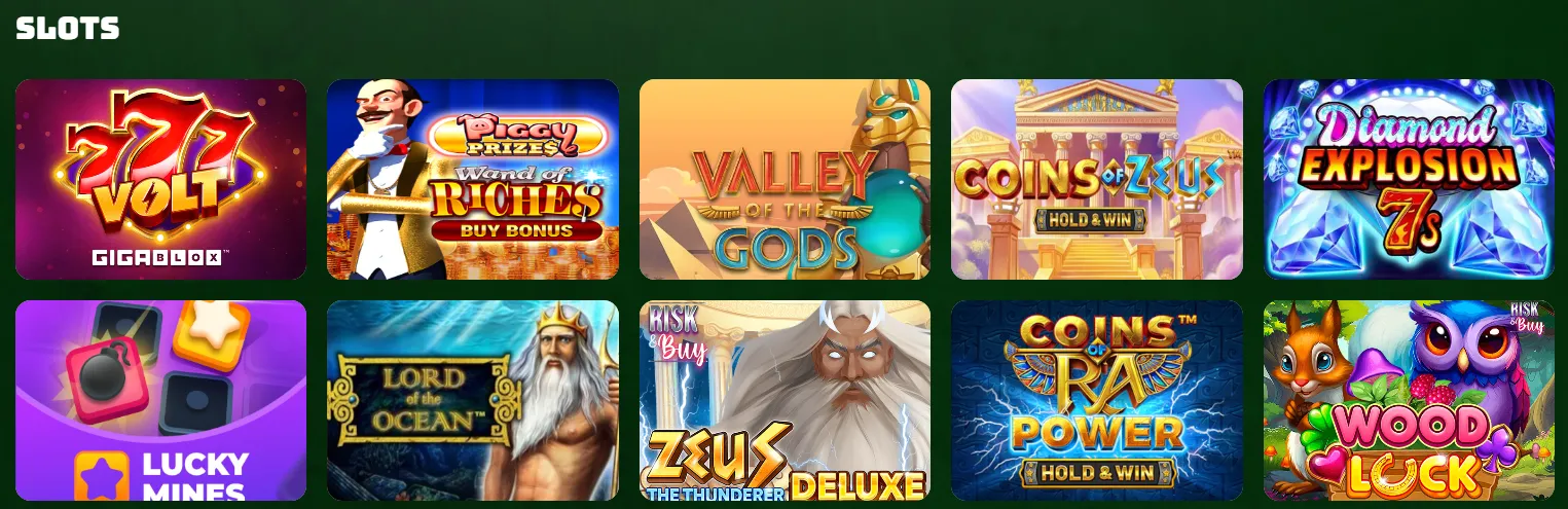 Die Slot-Sektion bietet mehrere tausend Spiele und deckt alle beliebten Genres ab: von Klassikern wie Big Bass Bonanza bis hin zu modernen Megaways-Titeln. Die RTP-Werte bewegen sich überwiegend rund um 96 %, was ein ausgewogenes Spielerlebnis ermöglicht. Viele Automaten verfügen über Bonuskäufe, Freispiele und spezielle Features, die besonders spannend für Vielspieler sind.
