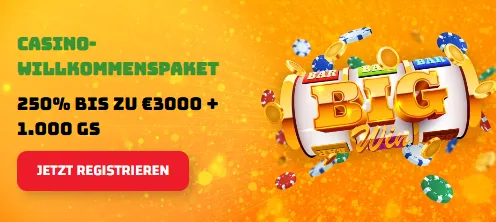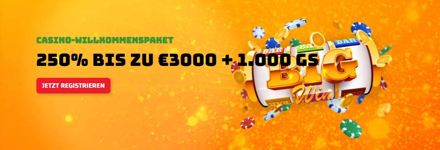 Der Start ins Casino beginnt mit einem starken Angebot: 250 % bis zu 3.000 € plus 1.000 Freispiele, verteilt auf die ersten drei Einzahlungen. Der Bonus kombiniert hohe Beträge mit einem großen Spielraum an Slot-Titeln. Die Umsatzbedingungen bewegen sich je nach Einzahlung zwischen dem 30- und 40-fachen – ausreichend Zeit und faire Durchspielraten sorgen dafür, dass der Bonus gut nutzbar bleibt. Eine Mindesteinzahlung von 20 € ist erforderlich.